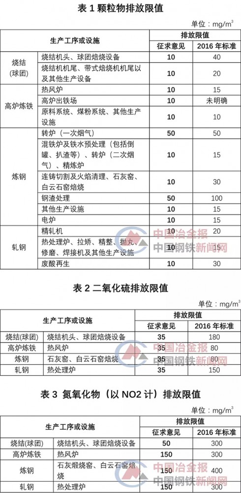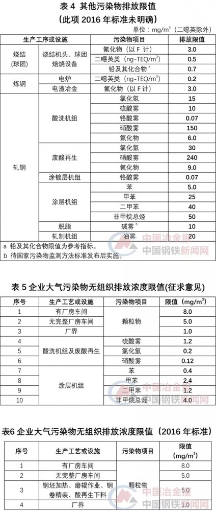 下列表格中“征求意見”是指河北省2018年4月份發布的《鋼鐵工業大氣污染物超低排放標準》(征求意見稿)內容,“2016年”標準,是指《河北省環境保護廳關于河北省鋼鐵行業執行大氣污染物特別排放限值的公告》(2016年 第1號)中規定的排放限值。